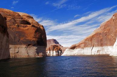 Keywords: high rock near rainbow bridge lake powell arizona usa page tourist attraction monument native sacred place landscape outdoor hot dry scenery nature desert landing pier water reservoir activity house boat idyll idyllic blue sky cirrus clouds
