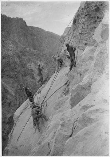 | Keywords: "High-scalers at work on the Arizona intake towers location some 550' above the level of the Colorado River. The... - NARA - 293714.jpg Scope and content Photograph from Volume Two of a series of photo albums documenting the construction of Hoover Dam Boulder City Nevada General notes 293714 Local identifier Department of the Interior Bureau of Reclamation Engineering and Research Center 05/18/1981 - 03/04/1988 NARA's Rocky Mountain Region Denver NRGA Building 48 Denver Federal Center West 6th Avenue and Kipling Street Denver CO 80225-0307 1932-07-28 Record group Record Group 115 Records of the Bureau of Reclamation 1889 - 2008 Record group ARC 444 Photograph albums compiled 1903 - 1972 Series ARC 293611 File unit File unit ARC Variant control numbers NAIL Control Number NRG-115-CONSTPHO85006-BC21347 Other versions <gallery> File High-scalers_at_work_on_the_Arizona_intake_towers_location_some_550'_above_the_level_of_the_Colorado_River _The _-_NARA_-_293714 tif tif File High-scalers_at_work_on_the_Arizona_intake_towers_location_some_550'_above_the_level_of_the_Colorado_River _The _-_NARA_-_293714 jpg jpg </gallery> NARA-cooperation PD-USGov Construction workers in the United States 1932 People associated with the construction of Hoover Dam workers high scalers |