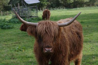 Keywords: highland cattle highland cow rind grassland green brown fur coat horn domesticated scottish breed herbage meadows grazing land pasture land