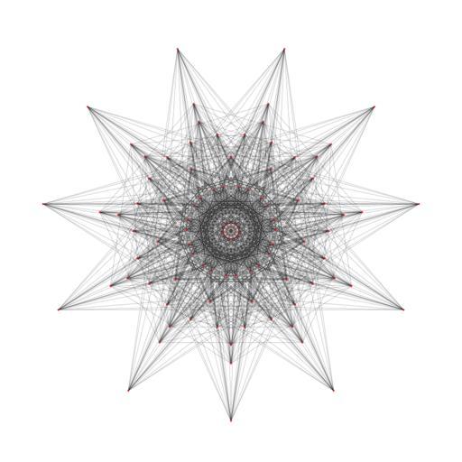 | Keywords: Higman-Sims-19.svg Higman-Sims graph as an orthogonal projection from a subset of the Leech lattice emphasizing a rotational symmetry of order 11 There are 11 possible such projections if we require all 22 points connected to the center point to form a regular 22-gon around it graphe de Higman-Sims comme projection orthogonale d'un sous-ensemble du réseau de Leech mettant en évidence une symétrie rotationnelle d'ordre 11 Il y a 11 telles projections possibles si on impose aux 22 points reliés au point central de former un 22-gone régulier autour de lui own Gro-Tsen 2010-10-30 Higman-Sims Graph |