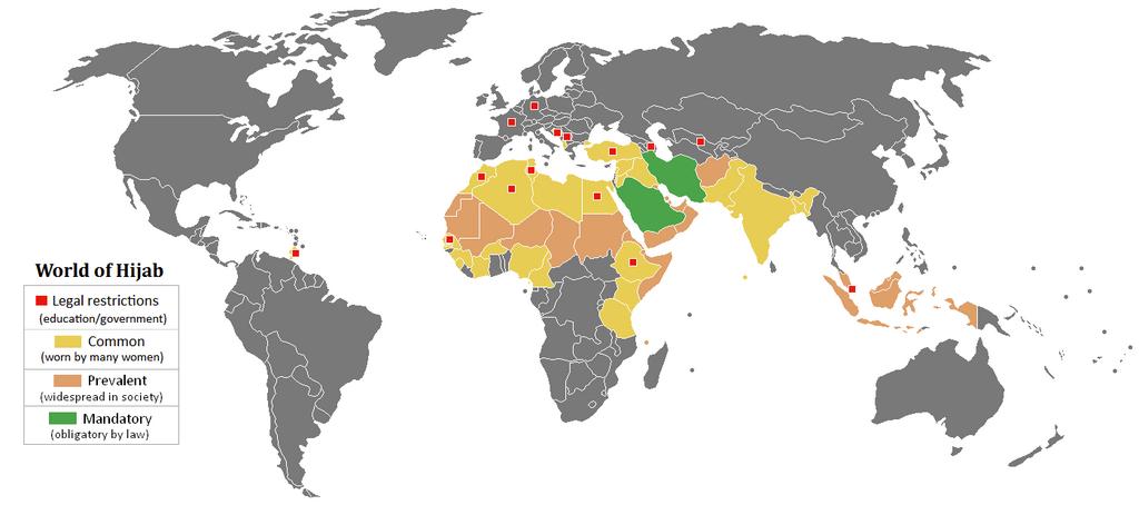 Keywords: Hijab.png law-related map en Map showing prevalence of Hijab wear across the world and indicating countries where there are restrictions on wearing it own <br>Legal restrictions sources by country <br> Azerbaijan http //www islam com az/modules/news/article php storyid 1098 Morocco http //www prohijab net/english/morocco-hijab-news htmhttp //news bbc co uk/1/hi/world/africa/5413808 stmhttp //parlemento wordpress com/2009/09/30/lambassadeur-du-maroc-a-bruxelles-pour-linterdiction-du-voile-islamique/ Tunisia http //news bbc co uk/1/hi/world/africa/5382946 stmhttp //news bbc co uk/1/hi/world/africa/6053380 stmhttp //www magharebia com/cocoon/awi/xhtml1/en_GB/features/awi/features/2006/10/27/feature-01http //jurist law pitt edu/paperchase/2006/10/tunisia-presses-enforcement-of-muslim php Egypt http //www quantara de/webcom/show_article php/_c-549/_nr-13/_p-1/i html PHPSESSID 133099http //news bbc co uk/1/hi/world/middle_east/3087220 stm Algeria http //news bbc co uk/1/hi/world/africa/7363456 stm Turkey http //www unhcr org/refworld/country IRBC TUR 4885a91a8 0 htmlhttp //www timesonline co uk/tol/news/world/middle_east/article1752230 ecehttp //news bbc co uk/1/hi/in_depth/world/2002/islamic_world/2144316 stmhttp //news bbc co uk/1/hi/world/europe/7441227 stmhttp //news bbc co uk/1/hi/world/europe/country_profiles/1023189 stm France http //news bbc co uk/1/hi/world/europe/3619988 stmhttp //hrw org/english/docs/2004/02/26/france7666 htm Germany http //news bbc co uk/1/hi/world/europe/3591043 stmhttp //www islamfortoday com/hijabgermany htm Senegal http //www islamicvoice com/january 2000/news htm HIJ Singapore http //news bbc co uk/1/hi/talking_point/debates/south_asian/1803073 stm Kosovo http //www bbc co uk/news/world-europe-11065911 Candelabra 2008-09-29 thumb Hijabs 2008 in Egypt |
