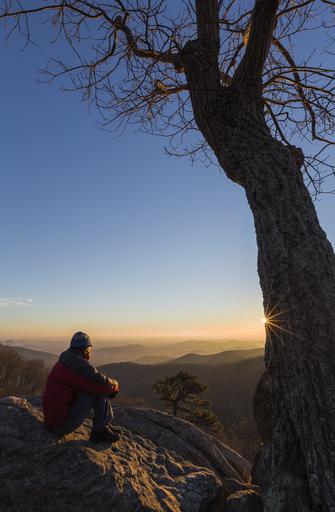 Keywords: hiker sunrise adventure trekking backpacker summit rock cliff peak landscape scenic panorama lifestyle outdoors hazel mountain overlook virginia shenandoah national park usa pensive serenity peaceful