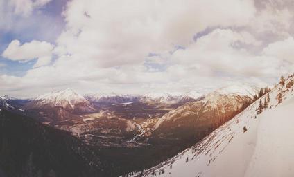 Keywords: hillside slope winter snow landscape mountain nature outdoor high highlands range view panorama vally above mountainside clouds scenic alpine nobody