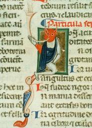 Keywords: Hippocrates aphorisms illumination.jpg Within the vertical stroke of the initial P of Patet kneeling humanoid grotesque with demonic red furred head large pointed ears or horns naked except for blue cloak red sleeve on r arm holds and blows large horn extending up to l r hand between legs Grotesque half-vine half-bird with blue wings orange beak l appears to bite the sole of demon's foot Adjacent text Hippocrates' Aphorismi Abstract Text in red immediately above image Particula septima Text to immediate right of text Consensus acutis morbis frigiditates extremitatum http //digital2 library ucla edu/viewItem do ark 21198/zz0001062p Unknown artist from Italy-Bologna ~ 1300 PD-old-100 14th-century illuminated manuscripts Files uploaded by PDTillman Medicine in medieval miniatures Aphorisms of Hippocrates |