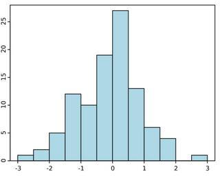 | Keywords: Histogram example.svg Example of histogram A random sample of 100 observations from the normal distribution N 0 1 Esimerkki histogrammista 100 havainnon satunnaisotos normaalijakaumasta N 0 1 Own 2007-04-03 Jkv PD-Own Created with R v R version 2 3 www r-project org library RSvgDevice devSVG histogram svg width 5 height 4 set seed 50 par mar c 3 2 1 1 yaxs i mgp c 1 8 9 0 hist rnorm 100 col lightblue main xlab ylab ylim c 0 28 box dev off histograms | ||||