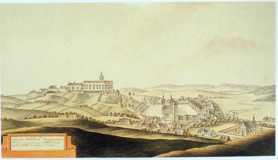 | Keywords: History of Náchod 03 - View of Náchod from Klínek.jpg  en View of Náchod from Klínek Pohled na Náchod z Klínku  Johann Venuto akvarel z roku 1814 podle kresby z roku 1786 Pohled na město se zámkem od západu na kterém je zachyceno spojení poddanského města se zámkem Na náměstí kostel sv Vavřince Znázornění obou městských bran Vpravo mimo ohrazené město kostel sv Michaela a nad ním Velký mlýn Občanskou zástavbu v ohrazeném městě převyšuje nově postavená synagoga která vytvořila novou dominantu města Oldřich Šafář Náchod v obraze čtyř století brožura 1814 Johann Venuto PD-old-100 History of Náchod 1814 paintings Watercolor paintings of landscapes History of Náchod Castle Paintings of castles in the Czech Republic |