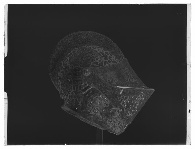 Keywords: Hjälm så kallad armet, ingående i Sigismund Augusts rustningsgarnityr för man och häst - Livrustkammaren - 19275-negative.tif Kunz Konrad Lochner sv Driven stålplåt med på utsidan etsad och kallemaljerad dekor Sammanlagt fem delar <br/>Klockan rundad lätt utdragen bakåt och uppåt med rundade släta sidor Upptill mjukt övergående i hög kam 50 mm avsmalnande framåt och bakåt Repstavsfilad Kammen framtill övergående i spetsig mittås Baktill vänster om kammen en förgylld plymhållare h 60 mm Rörformig nedåt avsmalnande med kanterna omvikta rundsmidda och filade med snedställda linjer Åt sidorna rundade vingar fästad med en nit <br/>Pannklaff med välvda bakåt utdragna sidor med rundade ändar Upptill i mitten driven ås som en fortsättning på klockans kam Spetsigt framparti hopgående med mittåsen Synspringor l 120 mm i mitten delade av åsens fortsättning I höger framkant 90 mm lång ten med cirkulärt tvärsnitt med yttre änden böjd och pekande ut 5 mm genom ett hål i pannklaffens kant <br/>Visir med svagt välvda och rundade kanter bakåt utdragna till smala skenor Framtill spetsig mittås med rak och nedåt inåtlutande profil I högra sidans nederkant en ögla och nedanför denna en blomformig nit rörlig i höjdled och på insidan förbunden med snett uppåtriktad ten Tenens övre ände fäst med nit <br/>Hakstycke i två delar hopgående omlott över hakan med vänster stycke över det högra Rundade konkava inre sidor Drivet hakparti med mittås I bakre kanterna gångjärn fäst med tre nitar I högra styckets kant en 20 mm djup urtagning för visirets nit Över kinden en nit med reter av avbruten del Över varje öra åtta runda hål Låsmekanism över hakan med på höger sida tapp och på vänster hål tappen låses med platt hasp av mässing <br/>Pannklaff visir och hakstycke gemensamt fästade i sidorna med genomgående skruv Mot utsidan mutter diam 20 mm rundad och formad som en blomma med tvärs över ett djupt spår för att vrida muttern Hjälmens nedre kanter formad till välvd rund och repstavsfilad skena för att löpa över kragens rundade kant <br/>Hjälmens insida svärtad med över panna och nacke nitade läderband På hackstycket foder av gult sidentyg med baksida av linnelärft Mjuk stoppning liknande vadd original caption decade 1550 leather - steel plate - linen - steel g 2550 size mm 280 220 360 LRK Sigismund II August av Polen Johan III av Sverige Hästen 1977 Sweden - A Royal Treasury 1988-1989 Eagle and Three Crowns 2002 Eagle and Three Crowns 2002 Quasi centrum Europae 2002 Major kings residing in Cracow 750årsjubileum av Krakows grundande 2007 Imagines potestatis - Regalia and Symbols of Authority of Polish Kings and Grand Masters of the Teutonic Knights 2007 Vasadynastin i Polen place of origin Nürnberg original filename LN_E00298 62721 inventory number LRK 26053 19275 CC0 Hjälm så kallad armet ingående i Sigismund Augusts rustningsgarnityr för man och häst - Livrustkammaren - 19275 tif <gallery caption Different images of same object > File Hjälm armet Lochner - Livrustkammaren - 77248 tif File Hjälm armet Lochner - Livrustkammaren - 202 tif File Hjälm sk armet ingående i Sigismund Augusts rustningsgarnityr för man och häst - Livrustkammaren - 77976 tif File Hjälm sk armet ingående i Sigismund Augusts rustningsgarnityr för man och häst - Livrustkammaren - 396 tif File Hjälm - Livrustkammaren - 60137 tif File Hjälm - Livrustkammaren - 51576 tif File Hjälm - Livrustkammaren - 43016 tif File Hjälm - Livrustkammaren - 34458 tif File Hjälm sk armet ingående i Sigismund Augusts rustningsgarnityr för man och häst - Livrustkammaren - 78320 tif File Hjälm - Livrustkammaren - 17334 tif File Hjälm - Livrustkammaren - 25896 tif File Hjälm armet Lochner - Livrustkammaren - 77246 tif </gallery> <gallery caption Related objects > File Sadel ingående i Sigismund Augusts rustningsgarnityr för man och häst - Livrustkammaren - 43197 tif LRK 26042 File Häststjärna - Livrustkammaren - 60135 tif LRK 26043 File Sadel ingående i Sigismund Augusts rustningsgarnityr för man och häst - Livrustkammaren - 9132 tif LRK 26042 File Häststjärna - Lochner - Livrustkammaren - 34283 tif LRK 26043 File Sadel ingående i Sigismund Augusts rustningsgarnityr för man och häst - Livrustkammaren - 1190 tif LRK 26042 File Sadel ingående i Sigismund Augusts rustningsgarnityr för man och häst - Livrustkammaren - 17497 tif LRK 26042 File Gumshorn på hästrustning i förgylld stålplåt - Livrustkammaren - 91533 tif LRK 26043 File Sadel Lochner - Livrustkammaren - 8652 tif LRK 26042 File Sadel ingående i Sigismund Augusts rustningsgarnityr för man och häst - Livrustkammaren - 60259 tif LRK 26042 File Bogpansar ingående i Sigismund Augusts rustningsgarnityr för man och häst - Livrustkammaren - 26960 tif LRK 26046 File Ryggharnesk ingående i Sigismund Augusts rustningsgarnityr för man och häst - Livrustkammaren - 69702 tif LRK 26059 File Benpansar - Livrustkammaren - 17332 tif LRK 26068 File Ländpansar ingående i Sigismund Augusts rustningsgarnityr för man och häst - Livrustkammaren - 35521 tif LRK 26047 File Benskena med harnesksko höger ingående i Sigismund Augusts rustningsgarnityr för man och häst - Livrustkammaren - 61199 tif LRK 26068 File Häststjärna - Livrustkammaren - 211 tif LRK 26043 File Manpansar ingående i Sigismund Augusts rustningsgarnityr för man och häst - Livrustkammaren - 61200 tif LRK 26044 File Benskena med harnesksko höger ingående i Sigismund Augusts rustningsgarnityr för man och häst - Livrustkammaren - 69762 tif LRK 26068 File Hästrustning - Livrustkammaren - 72697 tif LRK 26042 File Sadel - Livrustkammaren - 68697 tif LRK 26042 File Armskenor - Livrustkammaren - 43014 tif LRK 26062 File Ländpansar ingående i Sigismund Augusts rustningsgarnityr för man och häst - Livrustkammaren - 9836 tif LRK 26047 File Axelstycke h - Livrustkammaren - 68698 tif LRK 26060 File 