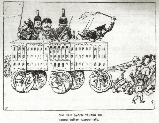 | Keywords: Hjeltin senaatti -pilakuva.jpg fi Perustuslaillisten näkökulmaa edustava pilakuva toisen sortokauden alkuvaiheessa toimineesta Hjeltin senaatista joka Taipuu mutta ei taitu vielä ja myöntyväisyyslinjaa edustaneista vanhasuomalaisista senaattoreista Senaatintalo venäläisten vaunuina rattaina vasemmalta senaattorit J K Paasikivi Hugo Rautapää Y K Yrjö-Koskinen August Hjelt ja J R Danielson-Kalmari Julkaistu Velikulta-pilalehdessä en Caricature of Finnish senate government in the beginning of the second period of russification of Finland Senators J K Paasikivi Hugo Rautapää Y K Yrjö-Koskinen August Hjelt and J R Danielson-Kalmari as wheels the senate palace as wagon and russian soldiers on board The text on the wall means Bends but doesn't crack yet and the text belove the picture Only five wheels under the wagon the wagon rocks as it goes Published in Finnish humour magazine Velikulta 1909-05-13 Marja Ylönen Pilahistoria Suomi poliittisissa pilapiirroksissa 1800-luvulta 2000-luvulle SKS Helsinki 2001; s 259 Alex Federley PD-old Uploaded with UploadWizard Alex Federley Political history of Finland Caricatures of Finland |