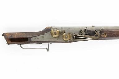 | Keywords: Hjullåsbockbössa, 1607 - Skoklosters slott - 90845.tif LSH artwork sv Bockpipa Runda över kammaren åttkantiga slätborrade På övre pipans kammare inslaget MT - 1607 Stöckel nr 4065 Sachsen Ståndsikte av mässing Korn av mässing <br/>Hjullås Dubbelt Låsbleck av tysk typ - bakåt avsmalnande genom två fall Hjulen med kapslar av förgylld mässing med graverade bladrankor På fängpannelocken graverade änglabyster Båda hanarna med lös underkäke fästade med samma studel Tryckknapp för snälltryck på låsbleckets bakre del <br/>Hel stock av brunt trä Tysk kolvtyp Över hela stocken ett punsat fjälliknande mönster med liten rosett i varje fjäll Graverade benplattor bakom svansskruvblad samt vid låsskruvar och pipstift Näsband av ben Tågformig s k holsteinsk varbygel <br/>Saknar tillbehör <br/>Märkt 129 ovanför låsblecket stanstyp 5373 Rött lacksigill ovanför kolvlådan nött original caption Hjullåsbockbössa 1607 <br/> Nyckelord 1600-tal Hjullåsbössa Hjullåsbockbössa Dekorerade Föremålsbild 1607 brass - wood - steel - bone size mm 116 size mm 1420 size mm 1125 pipa SKO place of origin Saxony original filename sm_dig7524 33739 inventory number SKO 12701 90845 CC-BY-SA Erik Lernestål Decoration 17th-century muskets in Livrustkammaren Wheellock firearms Photographs of weapons by Erik Lernestål Media contributed by LSH dim-with multiple size templates Media contributed by LSH unmatched keyword Media contributed by LSH 2016-05 |