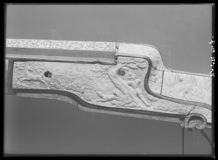Keywords: Hjullåsstudsare, Westphalen cirka 1660 - Livrustkammaren - 10505.tif LSH artwork sv Åttsidig sjuräfflad pipa bombredd 2 8 mm Rektangulärt svansskruvblad På kammaren en sköldformig stämpel med hand och därovanför tre otydliga bokstäver G H N LRK vägl 1921 155 Dekor i form av graverade blomrankor på kammaren runt siktet och bakom kornet På kammaren dessutom ett fält med landskap med en man och fyra springande hundar Riktmedel Ståndsikte av stål med bred u-formig skärm Spolformigt korn av mässing båda inlaxade Fästning Pipan fäst med krysskruv underifrån främre varbygelskruven samt tre pipstift av trä Hjullås av tysk typ plant låsbleck l 205 mm Dekor i form av graverade blomrankor i låg relief mot mörkskrafferad bakgrund Bakom hjulet ett ovalt fält med landskap däri ryttare som förföljer en springande hjort två hundar Utanpåliggande hjul fäst med halvcirkelformig uppåt breddad ring fäst med två skruvar kl 3 och 9 Svängd eldskärm avslutad med horisontell hjärtformig spets Fängpannelock med rörlig arm lockets framkant fasad och försedd med graverad dekor svängt rundat fingergrepp framtill avslutat med ett treflikigt blad Hane med fyrsidig kropp med rundad räfflad utsida ringformig hanhals med stor skärm lös överkäke Hals och käkar graverade som fågelhuvuden Uppåtböjt fingergrepp avslutat med en rund platt med spiralgravering Käkskruv med fyrsidigt huvud upptill koniskt med kulformig avslutning Hanfjäder med fasade kanter konturerad studel med glasögonformig genombrytning Avtryckarstången och fängpannelockets stoppfjädrar blånerade Fästning Två låsskruvar Avtryckare med konturerat och profilerat snälltryck Helstock av rödmålat trä rödbok nästan helt täckt med elfenbensplattor med snidad dekor Kolv av tysk typ med kolvlåda och vinge framtill avslutad med volut Den snidade dekoren föreställer landskap med jaktscener se Hellner Kolvlådelock av elfenben Kolvkula av stål Spetsrörka av elfenben med maskaron Topprörka och näsband samt bakplåten saknas Bred varbygel av stål med tre fingerlägen korta genombrutna armar på bygeln graverad rankdekor samt ovalt fält med landskap med jägare hund och hjort Tillbehör Laddstock av rödmålat trä l 742 mm i ena änden ett invändigt gängat stålrör l 119 mm Gåva till Karl XI från landshövdingen friherre Augustin Leijonsköld 1634-1682 original caption ca 1660 ivory e8 - eldvapen - stockdekor material elfenben - steel e1247 - eldvapen - pipa lås riktmedel och beslag material stål - brass e4 - eldvapen - riktmedel material mässing - beech e3 - eldvapen - stock material rödbok size mm 775 pipa size mm 1068 g 4430 LRK Karl XI av Sverige Augustin Leijonsköld Jakt 1973 Läckö slott Tre Karlar 1984-1985 Trofast - hov och tass i kunglig tjänst 2010-2011 Livrustkammaren Trogna vänner - Kungliga hästar och hundar 2011-2012 Museiverket/Finlands nationalmuseum basutställning G H N hand 1921 155 anv e1 - eldvapen - pipa; anonym pipsmed place of origin original filename LN_B16581_019461 39529 inventory number LRK 2919 10505 CC0 Hjullåsstudsare Westphalen cirka 1660 - Livrustkammaren - 10505-negative tif <gallery caption Different images of same object > File Bössa elfenben - Livrustkammaren - 86497 tif File Hjullåsstudsare Westphalen cirka 1660 - Livrustkammaren - 19075 tif File Hjullåsstudsare Westphalen cirka 1660 - Livrustkammaren - 19100 tif File Hjullåsstudsare Westphalen cirka 1660 - Livrustkammaren - 36190 tif File Hjullåsstudsare - Livrustkammaren - 95342 tif File Hjullåsstudsare Westphalen cirka 1660 - Livrustkammaren - 53308 tif File Hjullåsstudsare Westphalen cirka 1660 - Livrustkammaren - 1978 tif File Hjullåsstudsare Westphalen cirka 1660 - Livrustkammaren - 19067 tif File Hjullåsstudsare Westphalen cirka 1660 - Livrustkammaren - 44747 tif File Hjullåsstudsare Westphalen cirka 1660 - Livrustkammaren - 61869 tif File Hjullåsstudsare Westphalen cirka 1660 - Livrustkammaren - 44748 tif File Hjullåsstudsare Westphalen cirka 1660 - Livrustkammaren - 10538 tif File Hjullåsstudsare Westphalen cirka 1660 - Livrustkammaren - 27629 tif File Bössa elfenben - Livrustkammaren - 86498 tif </gallery> Muskets Media contributed by LSH dim-with multiple size templates Media contributed by LSH 2016-12 |
