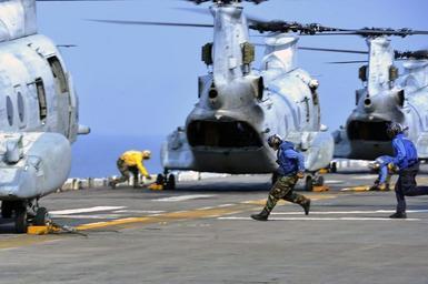 | Keywords: HMM-262 participates in Cobra Gold 2013 130214-N-SO729-199.jpg en Aviation boatswain's mates Handling run to remove chocks and chains from CH-46E Sea Knight helicopters assigned to Marine Medium Helicopter Squadron HMM 262 aboard the amphibious assault ship USS Bonhomme Richard LHD 6 The Bonhomme Richard Amphibious Ready Group is deployed in the U S 7th Fleet area of responsibility and taking part in Cobra Gold 2013 a Thai-U S co-sponsored multinational joint exercise designed to advance regional security by exercising a robust multinational force from nations sharing common goals and security commitments in the Asia-Pacific region U S Navy photo by Mass Communication Specialist 2nd Class Adam M Bennett 2013-02-14 Petty Officer 3rd Class adam bennett https //www dvidshub net/image/867628 130214-N-SO729-199 2013-02-15 19 49 USS BONHOMME RICHARD LHD 6 AT SEA PD-USGov-Military-Navy USS Bonhomme Richard LHD-6 Images from DoD uploaded by Fæ |