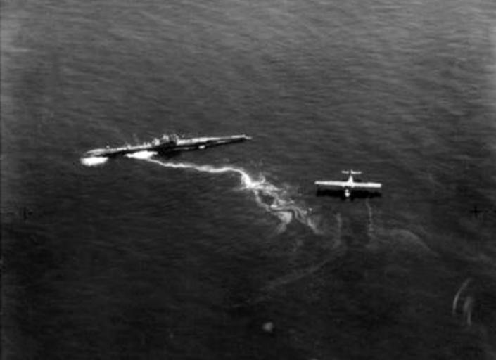 Keywords: HMS Telemachus (P321) with RAAF Catalina March 1945.jpg Aerial photo of a rendezvous between the British submarine HMS Telemachus P321 and a No 112 Air Sea Rescue Flight RAAF Consolidated Catalina PBY-5A s/n A24-54 in the Banda Sea Netherlands East Indies 23 March 1945 An engineer officer injured in an accident was transferred from the submarine to the Catalina by dinghy and flown to Darwin Australia for emergency surgery P01619 007 1945-03-23 The photo was taken with an F28 camera from No 21 Squadron RAAF Consolidated Liberator s/n A72-66 flown by Squadron Leader Ken Bowman at an altitude of 300 m Image copyright Copyright expired - public domain frame cropped 06 40 00 S 123 10 00 E PD-Australia HMS Telemachus P321 Consolidated Catalina RAAF World War II in March 1945 Black and white photographs |