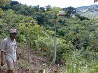 Keywords: HN999sRamon~SRP-tours5.jpg Description San Ramon President before retrieving the one golden fruit form the Carica papaya tree <br> Camera Info OLYMPUS SR83 Digital F-stop 5 6 Exposure 1/146<br> Create date 1999 09 01 09 58 43<br> Contact creator at http //Stockhausen yojoa org - Page also was a link called <u>San Ramon Choluteca Honduras 1999 first 'Solar net Village'</u> to access the full WEB collection ZackClark Mayors Nature_of_Honduras Farms Valleys of Honduras