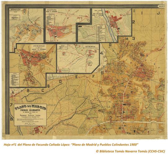 | Keywords: Hoja1 Plano FacundoCL.jpg es Hoja 1 del Plano de Madrid en 1900 dibujado por Facundo Cañada Descripción física del plano total por el autor El plano consta de 6 hojas cada una de las cuales mide 59 cm de altura por 72 cm de ancho de trabajo por supuesto nada de anchos de cenefas y por lo tanto al unirlas forman un plano que mide 1 44 metros de ancho y 1 77 de alto y las márgenes en blanco se está tirando escrupulosamente en ocho colores y en superior papel hallándose perfectamente grabado Facundo Cañada López 1900 Descripción cartográfica del plato total Plano de Madrid y Pueblos colindantes de Aravaca Canillas Canillejas Carabanchel Alto Carabanchel Bajo Chamartín El Pardo Real Sitio Fuencarral Getafe Hortaleza Leganés Pozuelo de Alarcón con sus barrios de Húmera y Estación; Vallecas Vicálvaro Villaverde etc al principiar el siglo XX El plano va acompañado de una Guía con el Directorio de Madrid y otras notas aclaratorias Información estadística y nomenclator del plano por el autor La superficie del término municipal de Madrid de la época es de 821 189 581 pies cuadrados equivalentes a 18 621 fanegas del marco de Madrid o sean 6475 hectáreas y 54 áreas; resultando de dicha superficie una proporción de 120 52 metros cuadrados por habitante pues estos son 528 984 según el último empadronamiento general verificado en 1º de Diciembre de 1900 En el plano se fijan los nombres de las plazas calles callejones cuestas etc que en la actualidad tienen detallándose la numeración que a cada casa corresponde dentro de cada manzana pues se fijan los primeros y últimos números de cada una de éstas al principiar las calles y después los últimos en las manzanas sucesivas y de esta manera resulta toda la numeración de cada calle 1900 http //idehistoricamadrid org/hisdimad/documents/plano html CSIC-Biblioteca Tomás Navarro Tomás Facundo Cañada PD-Scan PD-old-auto-1923 1913 cc-zero PD-old-auto 1913 Plano de Madrid y pueblos colindantes al empezar el siglo XX |