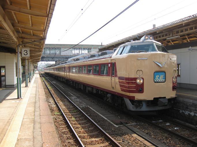 MAKE A MEME View Large Image Hokuetsu.JPG JR East 485 series set T18 on a Hokuetsu limited express service at Niitsu Station ja 国鉄色に戻されたT18編成 新津駅にて Own もんじゃ Monja 2008-08-12 JNR 485 JR East Niitsu Station Hokuetsu