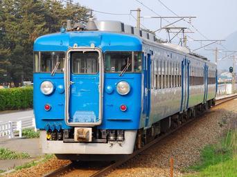 | Keywords: Hokuriku 457kei.JPG JR West 455/475 series 3-car set A18 in regional all-over blue livery leaving Etchū-Miyazaki Station on the Hokuriku Main Line ja 色 色のA18編成(越前宮崎駅ホームから撮影) Own toshinori baba 2010-05-04 JNR 455 JR West JNR 475 JR West Blue rail vehicles Taken with Nikon D40x 2010 in rail transport in Japan Trains of Hokuriku Main Line |