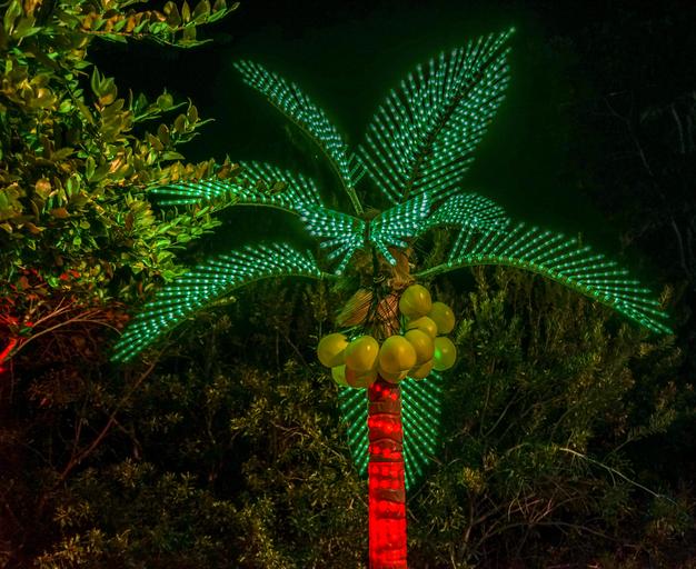 Keywords: holiday decorations botanical gardens florida christmas xmas season ornament festive merry trees colorful palm trees coconuts night photography