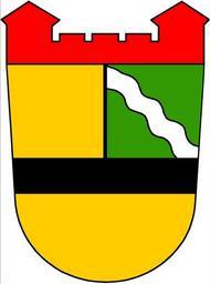 Keywords: Homberg(Duisburg) Wappen.png de Blasonierung Auf goldenem Grund geteilt durch einen schwarzen Querbalken in der oberen Hälfte links befindet sich das Wappen des Rheinlandes in grünem Feld einen linksschrägen silbernen Wellenbalken Das Oberwappen zeigt eine rote Mauerkrone mit zwei Türmen Die Bekrönung des Wappens stellt die Mauertürme des alten Homberger Hebeturmes am Rhein dar own Juergenk59 2009-12-05 DEU Homberg Ndrh COA svg Coats of arms from Duisburg |