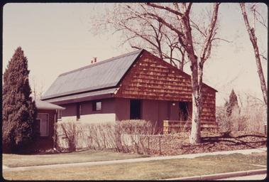 | Keywords: HOME OF ARCHITECT RICHARD CROWTHER, THAT IS HEATED WITH SOLAR ENERGY COLLECTED BY FLAT PLATE COLLECTORS. A FLAT BLACK... - NARA - 557326.jpg HOME OF ARCHITECT RICHARD CROWTHER THAT IS HEATED WITH SOLAR ENERGY COLLECTED BY FLAT PLATE COLLECTORS A FLAT BLACK ALUMINUM PLATE BEHIND THE GLASS ABSORBS SUNLIGHT AND HEATS AIR FORCED BETWEEN THE GLASS AND THE BLACK PLATE THE AIR IS THEN FORCED THROUGH A BIN CONTAINING SEVERAL TONS OF TWO INCH SIZED ROCKS THAT STORE THE HEAT BECAUSE OF EXTRA SPECIAL INSULATING FEATURES OF THIS HOME THE SOLAR HEATING SYSTEM PROVIDES ALMOST 90 PERCENT OF THE HEAT NEEDED Demeure de l'architecte Richard Crowther chauffée par l'énergie solaire obtenue par des panneaux plats Un fin panneau d'aluminium noirci derrière une vitre absorbe les rayons solaires et réchauffe l'air forcée entre le verre et le panneau Elle est alors conduit à travers une cuve contenant plusieurs tonnes de pierres de 6 cm environ qui stockent la chaleur Grâce aux très bonnes caractéristiques isolantes de cette habitation le chauffage solaire fournit presque 90 du besoin en chauffage Scope and content General notes 557326 Local identifier 412-DA-14874 Environmental Protection Agency 12/02/1970 - Norton Boyd 1936- Photographer 1111093 <br /> Denver Denver county Colorado United States North and Central America inhabited place 4201265 39 733 -104 98 <br /> Still Picture Records Section Special Media Archives Services Division NWCS-S National Archives at College Park 8601 Adelphi Road College Park MD 20740-6001 1975-05 Record group Record Group 412 Records of the Environmental Protection Agency 1944 - 2006 Record group ARC 708 DOCUMERICA The Environmental Protection Agency's Program to Photographically Document Subjects of Environmental Concern compiled 1972 - 1977 Series ARC 542493 File unit File unit ARC Variant control numbers Agency-Assigned Identifier 248/54/014874<br /> NAIL Control Number NWDNS-412-DA-14874 Other versions <gallery> File HOME_OF_ARCHITECT_RICHARD_CROWTHER _THAT_IS_HEATED_WITH_SOLAR_ENERGY_COLLECTED_BY_FLAT_PLATE_COLLECTORS _A_FLAT_BLACK _-_NARA_-_557326 tif tif File HOME_OF_ARCHITECT_RICHARD_CROWTHER _THAT_IS_HEATED_WITH_SOLAR_ENERGY_COLLECTED_BY_FLAT_PLATE_COLLECTORS _A_FLAT_BLACK _-_NARA_-_557326 jpg jpg </gallery> NARA-cooperation PD-USGov Houses in Denver Solar heating |