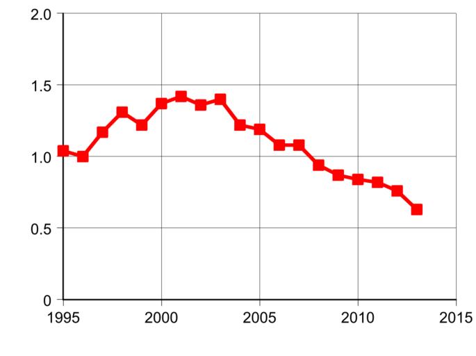 Keywords: Homicide Rate in Spain.svg en Homicide rate per 100 000 in Spain Data taken from http //www indexmundi com/facts/spain/homicide-rate 2016-08-22 own Delphi234 other versions current annually Generated with Wikimedia SVG Chart SVG Chart/box cc-zero Homicide rates Murder in Spain Diagrams labelled with numbers only |