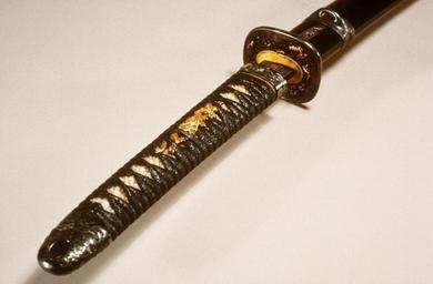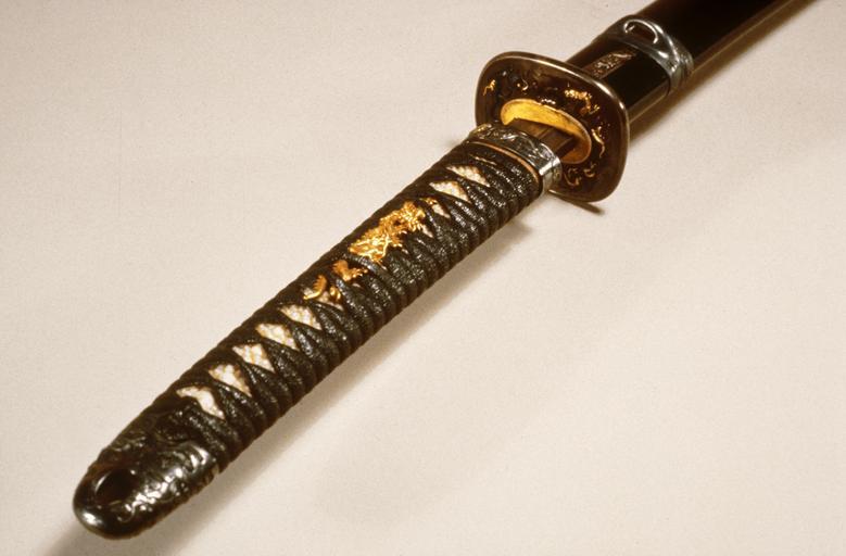 | Keywords: Honami Kokan - Long Sword ("Katana") with Dark Brown Saya with Silver Dragons and Clouds - Walters 511226 - Detail A.jpg  attributed to The gold inlay on this piece is attributed to Sadamune active 14th century by Honami Kokan active 1840s Sword 14th century; Gold Inlay 1840-1849 Muromachi; late Edo dark brown lacquer steel silver gold shakudo cm 72 1 l accession number 51 1226 31439 Henry Walters Baltimore date and mode of acquisition unknown Walters Art Museum Henry Walters Acquired by Henry Walters Inscription sadamune; honami kokanoju tsukuru kore itoo masatoshi; Translation Attribution to Sadamune by Honami Kokan 1842-1854 ; Translation Made by Special order by Ito Masatoshi The Nature of Loyalty Japanese Warrior Prints of the Nineteenth Century The Walters Art Gallery Baltimore 1989 place of origin Edo present-day Tokyo Japan Walters Art Museum license Tsuka katana Tosogu Japanese sword fittings in the Walters Art Museum Honami Kokan Itô Masatoshi |