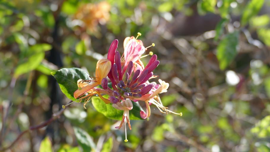 Keywords: honeysuckle flower red yellow leaves garden nature bloom spring macro