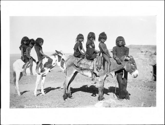 Keywords: Hopi children riding burros, Arizona, ca.1900 (CHS-4735).jpg en <br> Hopi children riding burros Arizona ca 1900 Photograph of Hopi children riding burros Arizona ca 1900 Six children ride on two burros three on each burro A man stands next to the burro on the right The burro on the left is a white burro with dark spots while the burro on the right is of a single color The lead boy is naked The others are all clothed in dresses shirts or blankets The man wears a dark long-sleeved shirt and dark pants Part of a structure is visible at right Call number CHS-4735 Photographer James George Wharton Filename CHS-4735 Coverage date circa 1900 Part of collection California Historical Society Collection 1860-1960 Format glass plate negatives Type images Part of subcollection Title Insurance and Trust and C C Pierce Photography Collection 1860-1960 Repository name USC Libraries Special Collections Accession number 4735 Microfiche number 1-76-23 Archival file chs_Volume98/CHS-4735 tiff Repository address Doheny Memorial Library Los Angeles CA 90089-0189 Geographic subject country USA Format aacr2 2 photographs glass photonegative photoprint b w ; 17 x 22 cm Rights Digitally reproduced by the USC Digital Library; From the California Historical Society Collection at the University of Southern California Subject adlf tribal areas Project USC Repository email specol usc edu Identifying number unidentified no James-1322 Contributing entity California Historical Society Date created circa 1900 Publisher of the digital version University of Southern California Libraries Format aat photographic prints; photographs Geographic subject state Arizona Legacy record ID chs-m17046; USC-1-1-1-13518 Access conditions Send requests to address or e-mail given Phone 213 821-2366; fax 213 740-2343 Subject file heading Indians -- Hopi Subject lcsh Indians of North America; Hopi Indians; Children Subject Hopi Indians circa 1900 date created James George Wharton http //digitallibrary usc edu/cdm/ref/collection/p15799coll65/id/17061 PD-old-70-1923 Images from USC Digital Library uploaded by Fæ California Historical Society Collection 1860-1960 Glass plate negatives Hopi children Photographs by George Wharton James |