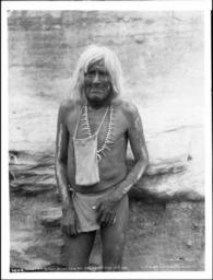 Keywords: Hopi Priest with bag of sacred meal for the Flute Dance Ceremony at the pueblo of Walpi, Arizona, ca.1898 (CHS-4644).jpg en <br> Hopi Priest with bag of sacred meal for the Flute Dance Ceremony at the pueblo of Walpi Arizona ca 1898 Photograph of a Hopi Priest with bag of sacred meal slung from his neck for the Flute Dance Ceremony at the pueblo of Walpi Arizona ca 1898 He wears only a loin cloth and a silver necklace His arms are decorated in white paint or dried mud He has straight white hair hanging to his shoulders A rocky wall is behind him Call number CHS-4644 Legacy record ID chs-m16969; USC-1-1-1-13885 Photographer James George Wharton Filename CHS-4644 Coverage date circa 1898 Part of collection California Historical Society Collection 1860-1960 Type images Geographic subject city or populated place Walpi Repository name USC Libraries Special Collections Accession number 4644 Microfiche number 1-162- Archival file chs_Volume97/CHS-4644 tiff Part of subcollection Title Insurance and Trust and C C Pierce Photography Collection 1860-1960 Repository address Doheny Memorial Library Los Angeles CA 90089-0189 Geographic subject country USA Format aacr2 3 photographs glass photonegative photoprints b w ; 22 x 17 cm 26 x 21 cm Rights Digitally reproduced by the USC Digital Library; From the California Historical Society Collection at the University of Southern California Subject adlf religious facilities Project USC Repository email specol usc edu Identifying number unidentified no James-305 Contributing entity California Historical Society Date created circa 1898 Publisher of the digital version University of Southern California Libraries Format aat photographic prints; photographs Geographic subject state Arizona Subject file heading Indians -- Hopi -- Flute Dance Geographic coordinates -110 397217 35 832218 Format glass plate negatives Access conditions Send requests to address or e-mail given Phone 213 821-2366; fax 213 740-2343 Geographic subject county Navajo Subject lcsh Indians of North America; Hopi Indians; Dance; Rites and ceremonies Subject Hopi Indians; Hopi Flute Ceremony circa 1898 date created George Wharton James 1858 1923 http //digitallibrary usc edu/cdm/ref/collection/p15799coll65/id/16888 PD-old-70-1923 Images from USC Digital Library uploaded by Fæ Photographs by George Wharton James California Historical Society Collection 1860-1960 Glass plate negatives Hopi men |