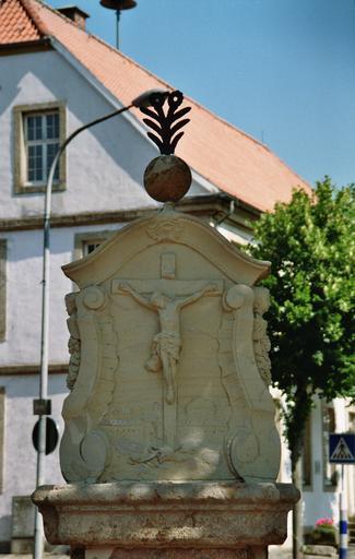 Keywords: Hopsten Bildstock Marktplatz 14.jpg en Wayside shrine at the market square of Hopsten Kreis Steinfurt North Rhine-Westphalia Germany It is a listed cultural heritage monument de Bildstock auf dem Marktplatz von Hopsten Kreis Steinfurt Nordrhein-Westfalen Deutschland Das teilweise stark verwitterte Kunstwerk stammt aus dem 18 Jahrhundert à ber dem altarartigen Postament erhebt sich zurückgesetzt das Sandsteinrelief im geschweiften Rahmen Die eine Seite des Oberteils zeigt eine Pietà die andere den Gekreuzigten über der Stätte Golgatha Foto Laut Denkmalliste ist der Bildstock žein städtebaulich prägendes Objekt am Marktplatz von Hopsten und žals Beispiel der barocken Bildstockgestaltung des westfälischen Typs von hoher Bedeutung Als žsakrales Denkmal steht er seit 1986 unter Denkmalschutz Inventarnummer A 20 Im Jahr 2012 wurde der Bildstock gründlich gereinigt und überarbeitet Das Foto entstand kurz nach dieser Reinigungsaktion 20 own J -H Janßen 2012-07-10 Bildstock Marktplatz Hopsten July 2012 in Germany 20120710 Hopsten 2012 in Hopsten 20120710 Hopsten Bilder von J -H Janßen Cc-zero |