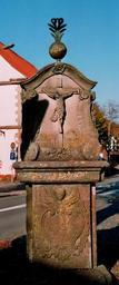 Keywords: Hopsten Bildstock Marktplatz 2.jpg en Wayside shrine at the market square of Hopsten Kreis Steinfurt North Rhine-Westphalia Germany It is a listed cultural heritage monument de Bildstock auf dem Marktplatz von Hopsten Kreis Steinfurt Nordrhein-Westfalen Deutschland Das teilweise stark verwitterte Kunstwerk stammt aus dem 18 Jahrhundert à ber dem altarartigen Postament erhebt sich zurückgesetzt das Sandsteinrelief im geschweiften Rahmen Die eine Seite des Oberteils zeigt eine Pietà die andere den Gekreuzigten über der Stätte Golgatha Foto Laut Denkmalliste ist der Bildstock žein städtebaulich prägendes Objekt am Marktplatz von Hopsten und žals Beispiel der barocken Bildstockgestaltung des westfälischen Typs von hoher Bedeutung Als žsakrales Denkmal steht er seit 1986 unter Denkmalschutz Inventarnummer A 20 Der Bildstock wird von zwei älteren Linden flankiert 20 own J -H Janßen 2011-10-22 Bildstock Marktplatz Hopsten October 2011 in Germany 20111022 Hopsten 2011 in Hopsten 20111022 Hopsten Bilder von J -H Janßen Cc-zero |