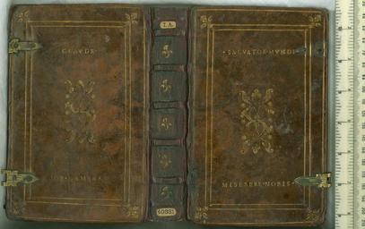 | Keywords: Horae- ad usum Parisiensem (Paris) -French and Latin- -Imprint- Paris- Philippe Pigouchet, for Simon Vostre, 23 Dec. 1497 - - - Upper and lower cover and spine (IA.40331).jpg Style Panel design Lettered cover eg intitals titles Centrepiece made of small tools Star Floral Azured or hatched motifs; Caption Upper and lower cover and spine; Colour Brown; Edge Gilt exhibition history Decorative Technique Tooled in gold; Cover Material Calf Format 8° ISTC No ih00352700 BMC VIII 118 The binding has been repaired Wooden boards Traces of 2 pairs of clasps catching on to the upper cover Ink ms notes on the upper free endleaves including a drawing of a coat of arms Lower cover is tooled Claude de Lamer Upper cover Salvator Mundi Miserere Nobis object history Text 1497; Paris; La Mer Claude de object type Cc-zero place of creation Binding France place of discovery Unspecified British Library image http //www bl uk/catalogues/bookbindings/LargeImage aspx RecordId 020-000017925 ImageId ImageId 56800 Copyright BL Horae ad usum Parisiensem Paris French and Latin Imprint Paris Philippe Pigouchet for Simon Vostre 23 Dec 1497 Uploaded with GWToolset Horae ad usum Parisiensem Paris French and Latin Imprint Paris Philippe Pigouchet for Simon Vostre 23 Dec 1497 - Upper and lower cover and spine IA 40331 http //www webarchive org uk/bldatasets/bindings/ia40331 jpg Bookbinding 16th-century bookbinding British Library Bookbindings |