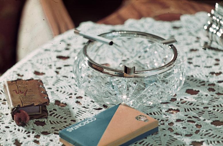 Keywords: Horgolt kézimunka abrosz, ólomkristály hamutartó, Coronitas cigaretta, bőr gyufásdoboz tartó függő viaszpecséttel. Fortepan 12299.jpg Check categories 2016 June 12 hu Horgolt kézimunka abrosz ólomkristály hamutartó Coronitas cigaretta bőr gyufásdoboz tartó függő viaszpecséttel Tags colorful cigarette ashtray smoking Title Horgolt kézimunka abrosz ólomkristály hamutartó Coronitas cigaretta bőr gyufásdoboz tartó függő viaszpecséttel http //www fortepan hu/_photo/download/fortepan_20777 jpg 1942 Fortepan 12299 http //www fortepan hu/_photo/download/fortepan_20777 jpg http //www fortepan hu/ lang en img 12299 Unknown The release at fortepan hu is CC-BY-SA-3 0 As the photographer is unknown or pseudonymous and the photograph is Age 1942 01 01 years old it is considered public domain both in the country of publication Hungary and the USA where Wikimedia Commons is hosted See Fortepan HU for more information on related uploads PD-anon-70-EU PD-anon-auto-1996 1942 Hungary DEFAULTSORT Fortepan 012299 1942 photographs Colour photographs from Fortepan World War II color photographs in Hungary Images uploaded by Fæ