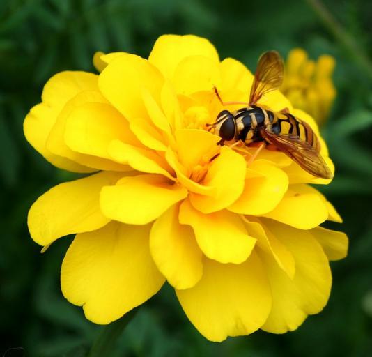 Keywords: hornet wasp bee flower yellow marigold stinger fly flying honey pest nature insect bug floral wildlife pollination pollen wings bumblebee
