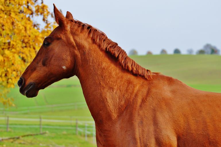 Keywords: horse animal ride reiterhof brown coupling meadow leaves autumn colorful