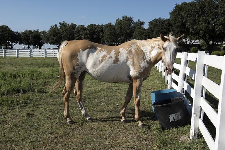 Keywords: horse corral fence ranch animal livestock outdoors pen looking food water spotted