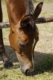 Keywords: horse head horse pferdeportrait fence arabs coupling paddock pasture portrait animal brown eat foal young animal