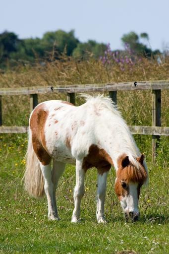 Keywords: horse pony shetland pony brown white cute pet animal equine photo image grazing eating grass