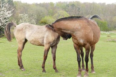 Keywords: horses couple friendship pasture green brown