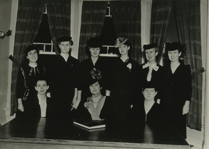 | Keywords: Sarnia, Ontario, 1946. Some of the officers of St. Joseph's Hospital, Sarnia, Auxiliary, March 1946, which is raising $10,000 for furnishing the nursery of the new institution. Front row, L to R - Mrs. F. Sackfield, Mrs. N.H. Glaab, Miss Maud Stanley. Back row, L to R - Mrs. A Lever, Mrs. F. Moran, Mrs T. Deveraux, Mrs. C. Brown, Mrs L. Houlihan, Mrs. G.E. Stewart. Absent - Mrs. G.L. Hickey and Mrs. S. Clemence. hospital healthcare londonontario sarniaontario sistersofstjoseph | ||||