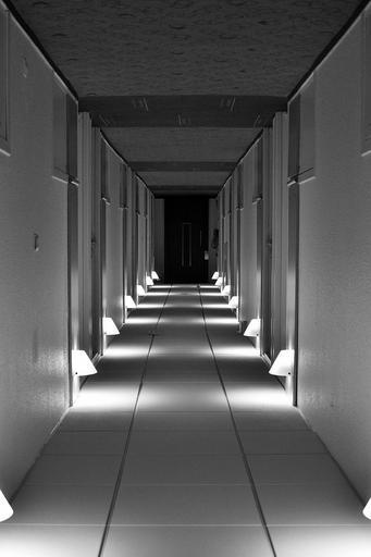 Keywords: hotel hall passage hallway corridor interior empty building passageway architecture black and white