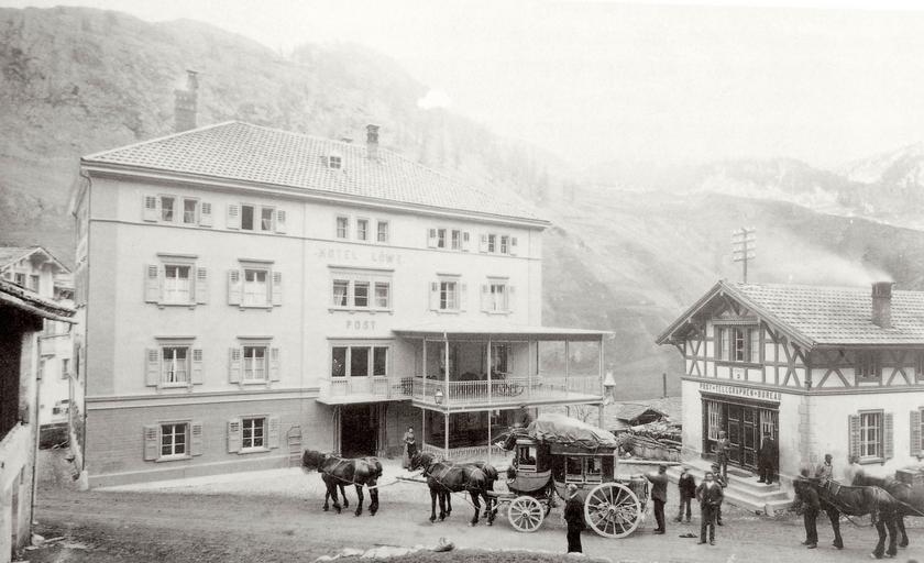 Keywords: Hotel Löwen 1896.JPG Posthotel Löwen in Mulegns GR erste bekannte Aufnahme 1896 von Romedo Guler 1836-1909 noch ohne den Anbau rechts aber mit neuer Veranda Rechts das Postbüro Bündner Monatsblatt 3/2012 1896 Romedo Guler Posthotel Löwen PD-old |