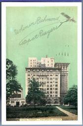 Keywords: vcu libraries vculibraries vcu digital collections vcudigitalcollections photo border outdoor text Description: Hotel Rueger, 9th and Bank Sts., Richmond, Va. Hotel Rueger is a modern, fireproof structure. Located in the heart of the business district, and occupying a commanding position overlooking the Capitol Square with its historic building and monuments, is ideally situated to afford comfort and convenience to the commercial traveler and tourist. Established in 1846, 'RUEGERS' is known the country wide for its excellent food and service. The Hotel is exclusively European Plan for ladies and gentlemen. It contains 130 bed-rooms, most of which are fitted with private baths and showers. Every room has a ceiling fan. Modern Garage attached to main building. Manufacturer: Lumitone Photoprint, New York Date Postmarked: 1934 Rights: This item is in the public domain. Acknowledgement of the Virginia Commonwealth University Libraries as a source is requested. Reference URL: dig.library.vcu.edu/u?/postcard,85 Collection: Rarely Seen Richmond: Early twentieth century Richmond as seen through vintage postcards Description: Hotel Rueger, 9th and Bank Sts., Richmond, Va. Hotel Rueger is a modern, fireproof structure. Located in the heart of the business district, and occupying a commanding position overlooking the Capitol Square with its historic building and monuments, is ideally situated to afford comfort and convenience to the commercial traveler and tourist. Established in 1846, 'RUEGERS' is known the country wide for its excellent food and service. The Hotel is exclusively European Plan for ladies and gentlemen. It contains 130 bed-rooms, most of which are fitted with private baths and showers. Every room has a ceiling fan. Modern Garage attached to main building. Manufacturer: Lumitone Photoprint, New York Date Postmarked: 1934 Rights: This item is in the public domain. Acknowledgement of the Virginia Commonwealth University Libraries as a source is requested. Reference URL: dig.library.vcu.edu/u?/postcard,85 Collection: Rarely Seen Richmond: Early twentieth century Richmond as seen through vintage postcards |