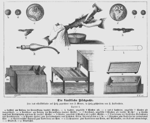 Keywords: Hottinger Volksblatt 1878 228 Bild1.jpg künstliche Fischzucht Tafel I man-made fish farming Table I Volksblatt Eine Wochenzeitschrift mit Bildern Herausgegeben von Dr Christlieb Gotthold Hottinger self scanned Seite 228 1878 Straßburg im Elsaß Verlag von Dr Hottingers Volksblatt PD-old Hottinger's Volksblatt 1878 Fish farming in Germany |