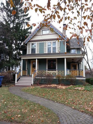 Keywords: house blue home architecture building property residential yard exterior grass structure porch wealth fall autumn victorian steps path