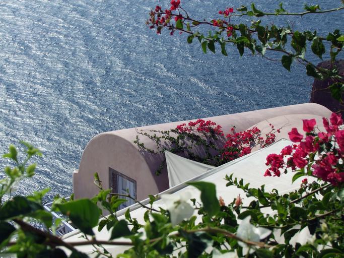Keywords: house by the sea the crater rim cycladic style bougainville plant romantic greece santorin architecture