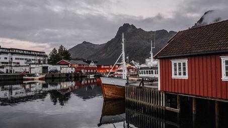 Keywords: house wooden home wood architecture norwegian sea north island mountain scenic village water europe scenery sky nordic travel nordland wooden house fisherman's village dusk