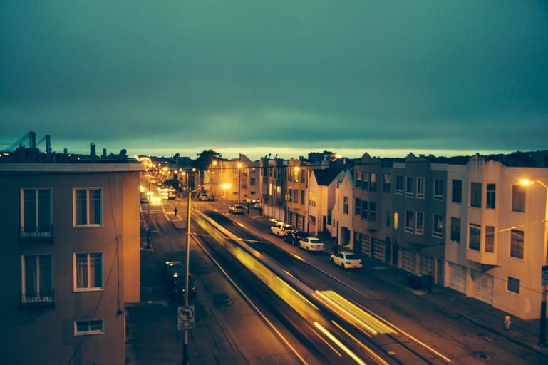 Keywords: houses apartments neighborhood neighbourhood roads streets lights lamp posts dark evening dusk cars intersection