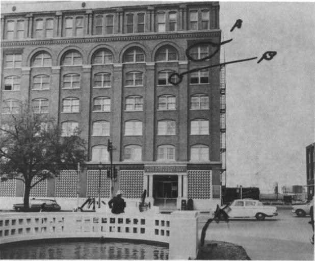 | Keywords: HowardBrennan.jpg Howard Leslie Brennan sitting across the street from the Texas School Book Depository in the same position in Dealey Plaza in Dallas where he saw a man shooting a rifle at U S President John F Kennedy from the corner window of the sixth floor on November 22 1963 Photograph as marked by Brennan from the Warren Commission Hearings and Evidence vol 17 p 197 Commission Exhibit 477 The photograph was taken on March 20 1964 and marked by Brennan during his testimony to show the window A in which he saw a man with a rifle and the window B on the fifth floor in which he saw people watching the motorcade PD-USGov 1964 in Dallas Texas School Book Depository Black and white photographs Warren Commission |