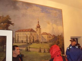Keywords: Hraběcí zastávka.JPG cs Turisté v maličké Hraběcí zastávce malinká místnost na nádraží s vchodem z peronu s dvěma obrazy own Zákupák 2013-06-01 Doksy train station