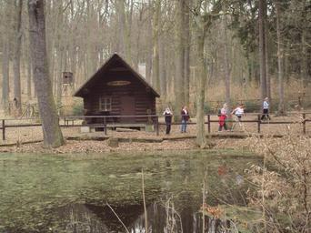 Keywords: Hubertova 3.JPG cs Srub a jezírko uprostřed naučné stezky výlet turistů own Zákupák 2013-04-17 Naučná Hubertova stezka KČT Česká Lípa